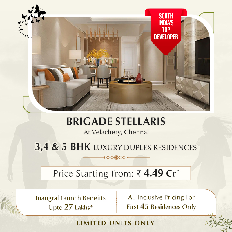 Brigade Stellaris is a premium pre-launch residential address by the trusted Developer, located in the heart of Velachery, Chennai. The project offers thoughtfully designed3 & 4 BHK Luxury Duplex Residences with smart layouts, contemporary interiors and high-quality fittings — ideal for modern families. Residents will enjoy a full suite of lifestyle amenities including a clubhouse, gym, landscaped gardens and more coming soon. With excellent connectivity to major roads and public transport, and neighbourhood access to schools, hospitals, offices and malls, Brigade Stellaris combines luxury, convenience and long-term value.